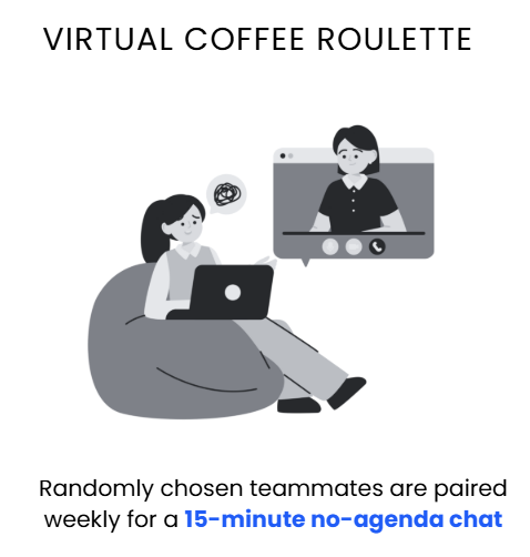 One experiment: a “virtual coffee roulette,” where two randomly chosen teammates are paired weekly for a 15-minute no-agenda chat.